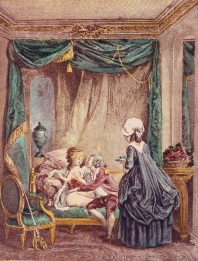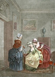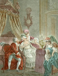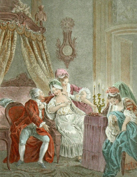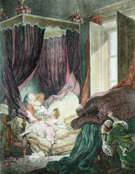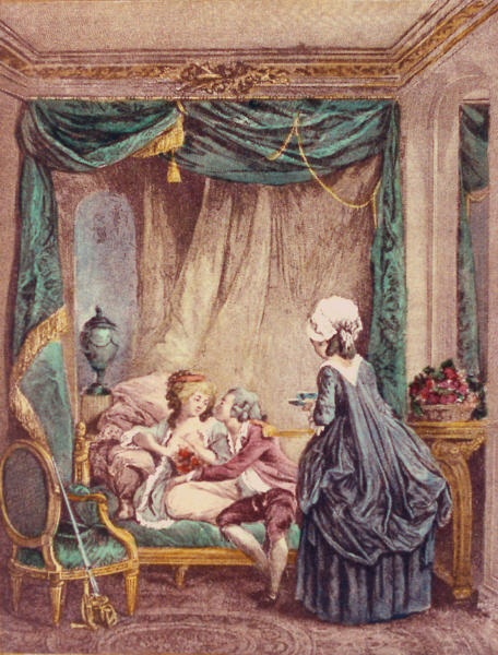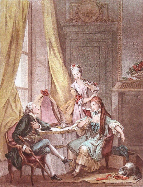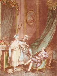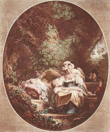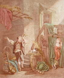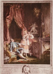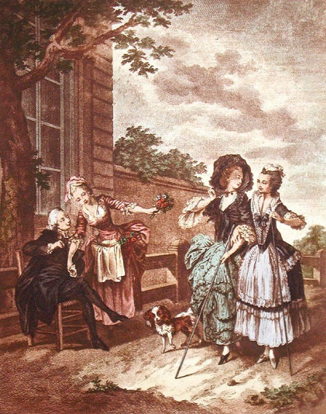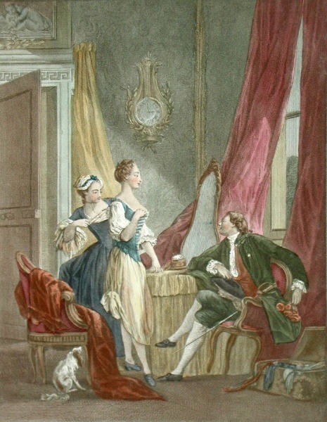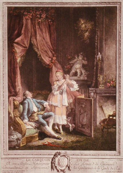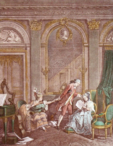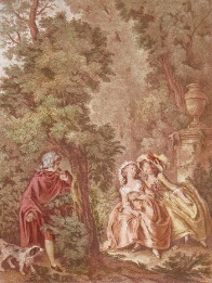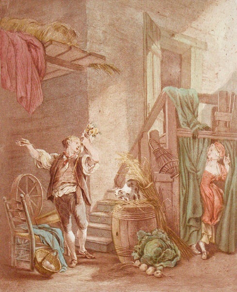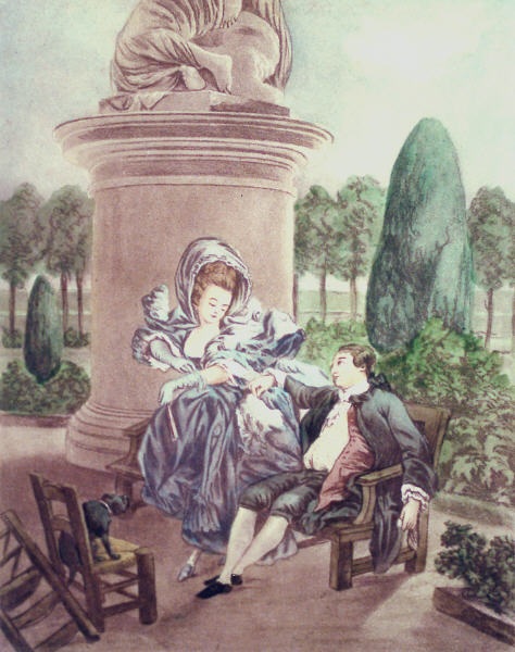 Decorative hand coloured French etchings with a romantic theme, depicting typical eighteenth century bourgeois scenes